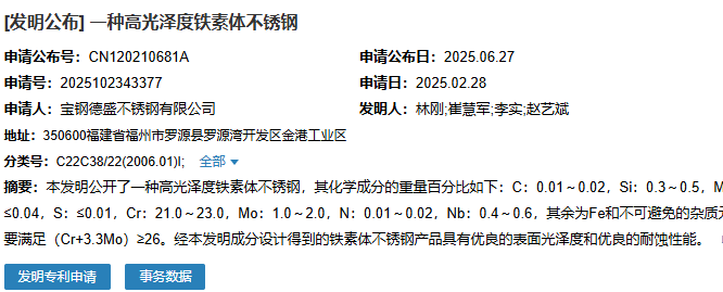 2025年6月27日,寶鋼德盛不銹鋼有限公司成功申請一項名為“一種高光澤度鐵素體不銹鋼”專利,申請公布號為CN120210681A,申請日期為2025年2月28日。