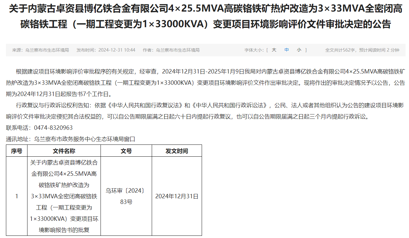 2024年12月31日,烏蘭察布市生態環境局就內蒙古卓資縣博億鐵合金有限公司4×25.5MVA高碳鉻鐵礦熱爐改造為3×33MVA全密閉高碳鉻鐵工程(一期工程變更為1×33000KVA)變更項目環境影響評價文件作出審批決定并對外進行公告,公告期:7個工作日。