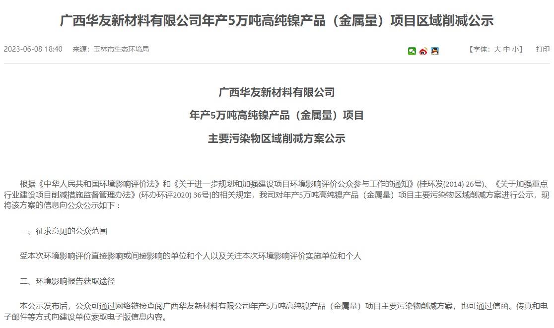 6月8日,廣西華友新材料有限公司年產5萬噸高純鎳產品(金屬量)項目主要污染物區域削減方案公示。